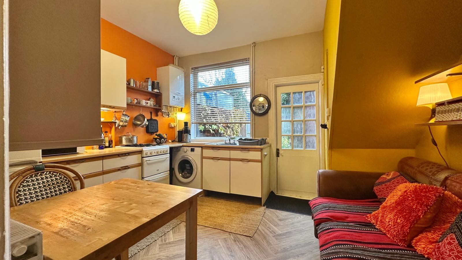 Ample wall and base units with work tops over, stainless steel sink unit with mixer tap, space for gas cooker, space for fridge freezer, space for washing machine, Valiant combi boiler, central heating radiator, double glazed window to the rear, door to stairs leading off to the first floor, door to rear garden.
