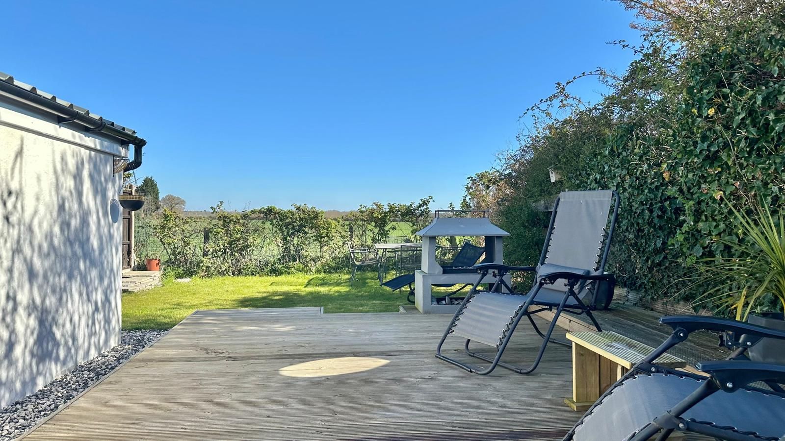 Being laid to lawn. Fenced to side, bushes to other side. Decked Area overlooking Rear Coombe fields. Garage with Rear vehicle access.