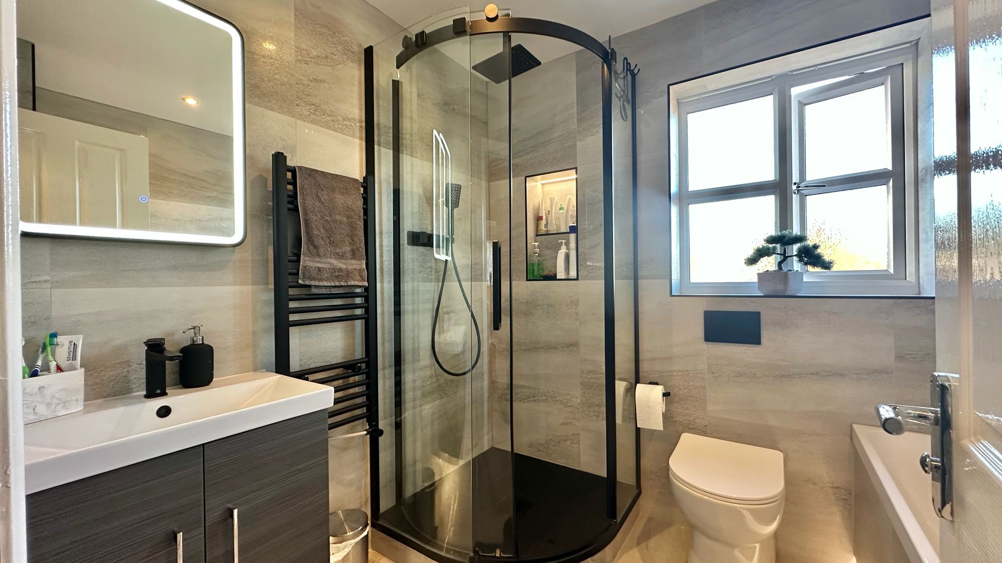 Low level WC, vanity sink unit with storage below, corner shower cubicle with rainfall shower, secondary hose & shower niche, tiled bath with hose & bath niche, UPVC Double glazed window to the rear & black towel radiator, fully tiled walls & floor.