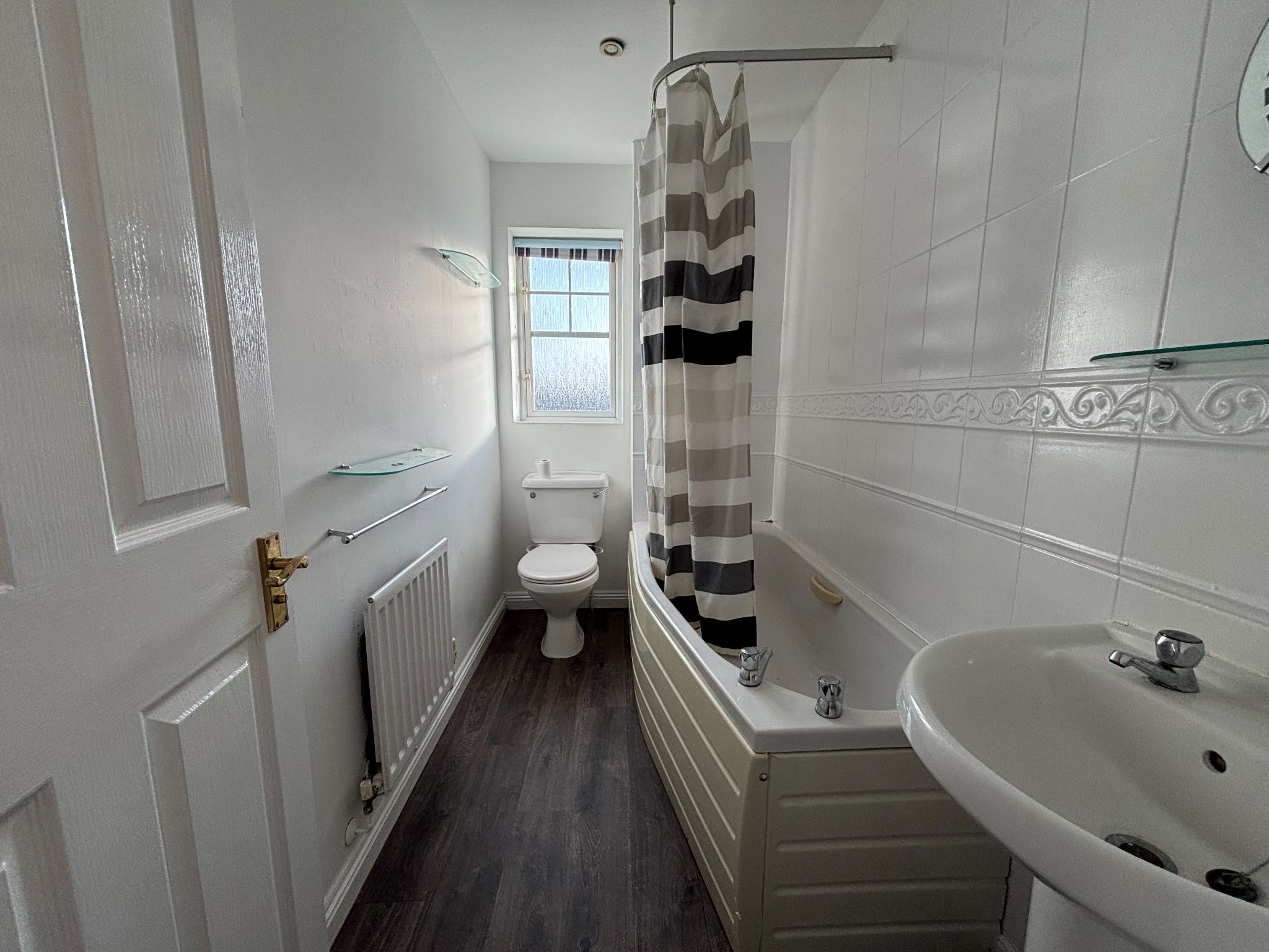 Fitted modern white suite comprising of panelled bath with shower over, wc and wash hand basin.