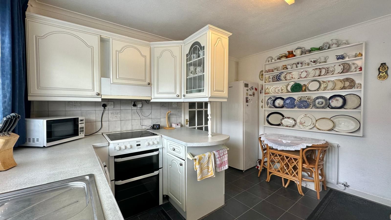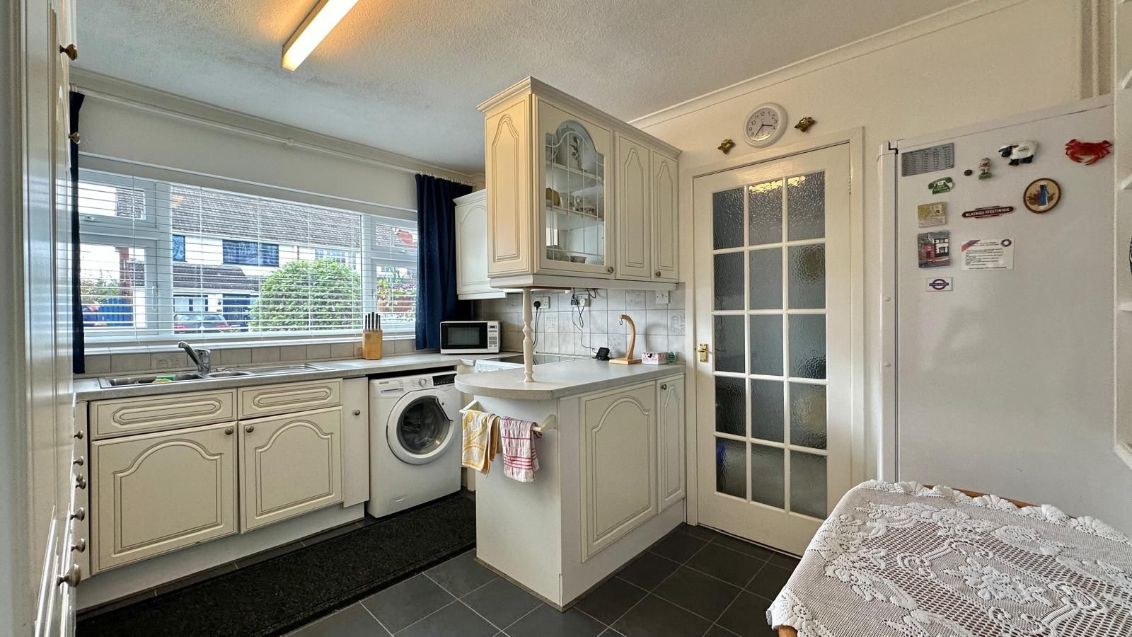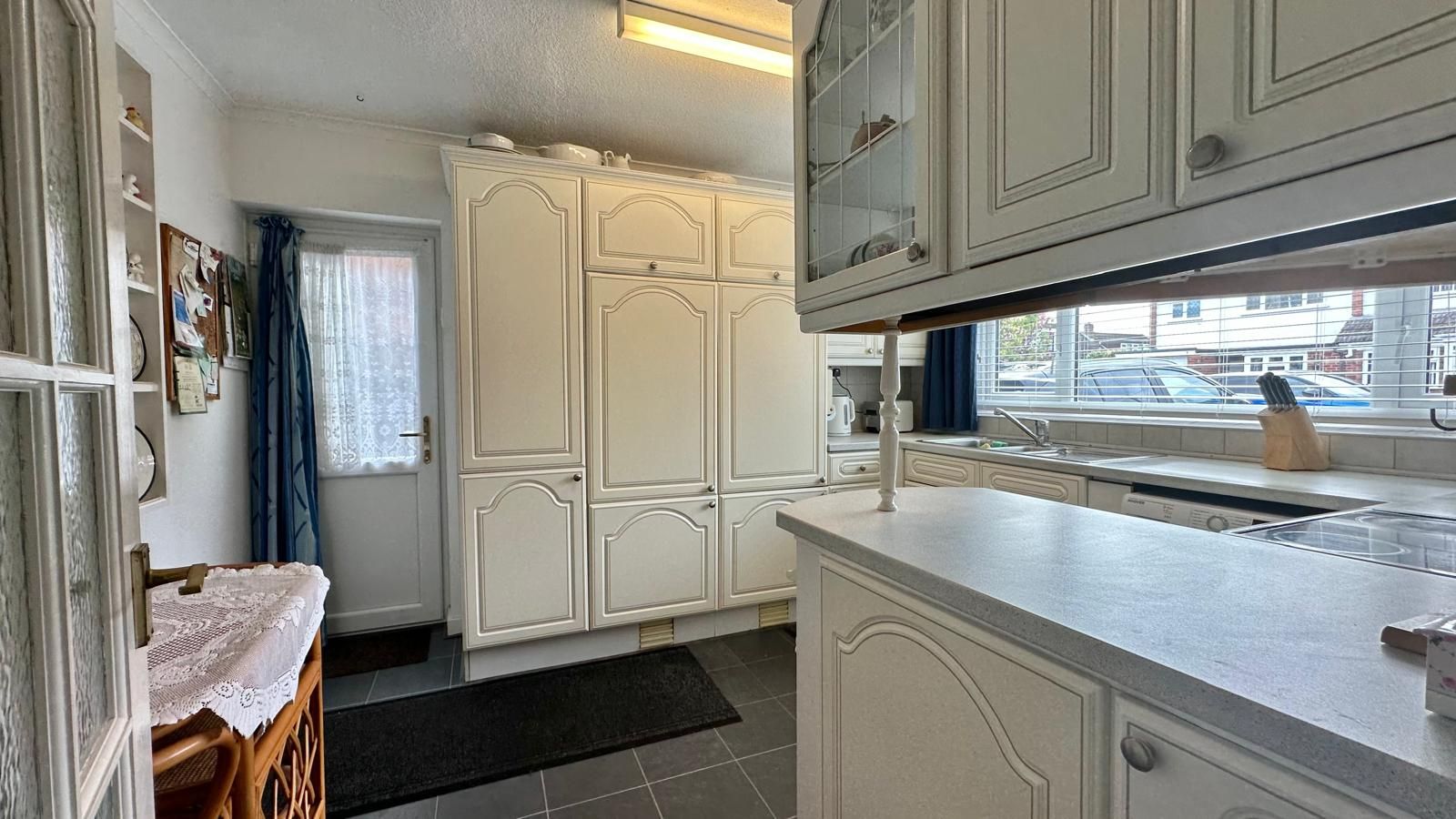 Ample wall & base units with work tops over, stainless steel sink unit with drainer & mixer tap, space for cooker, space for washing machine, integrated fridge/freezer, space for additional fridge/freezer, laminate floor, tiled splashbacks, central heating radiator, UPVC double glazed window to the front, UPVC double glazed door to the driveway.