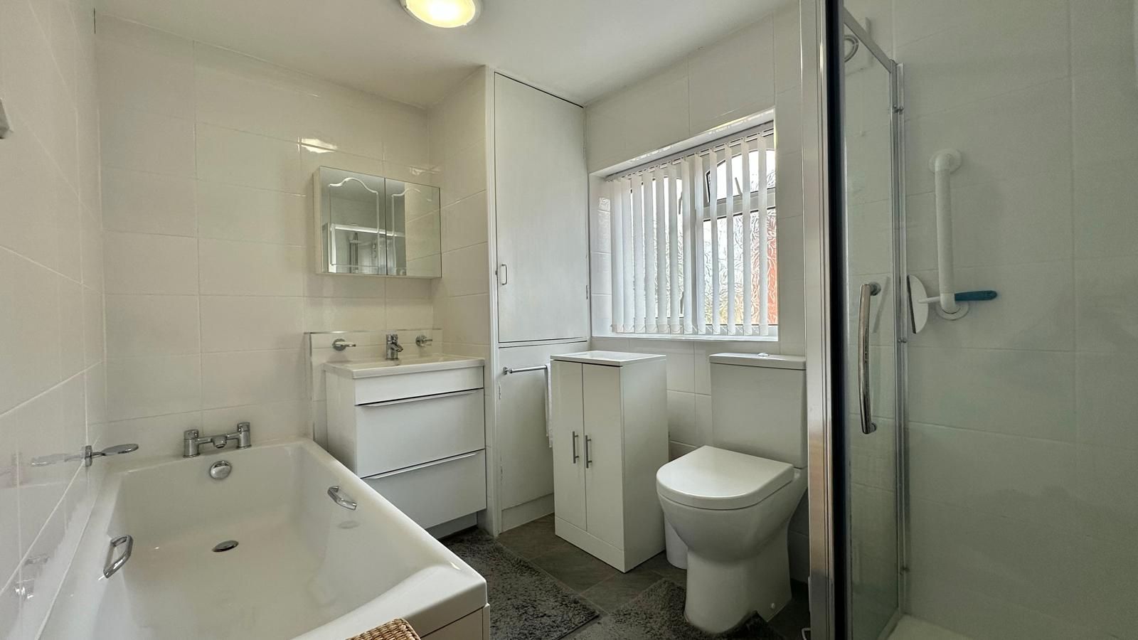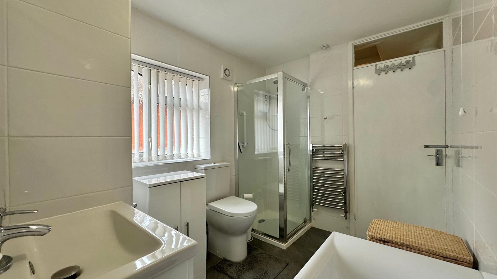Low level WC, vanity sink unit with storage below & mixer tap, panelled bath, corner shower cubicle with electric shower, built in cupboard housing boiler & hot water tank, fully tiled walls, chrome heated towel rail. Extractor fan. UPVC double glazed window to the side.
