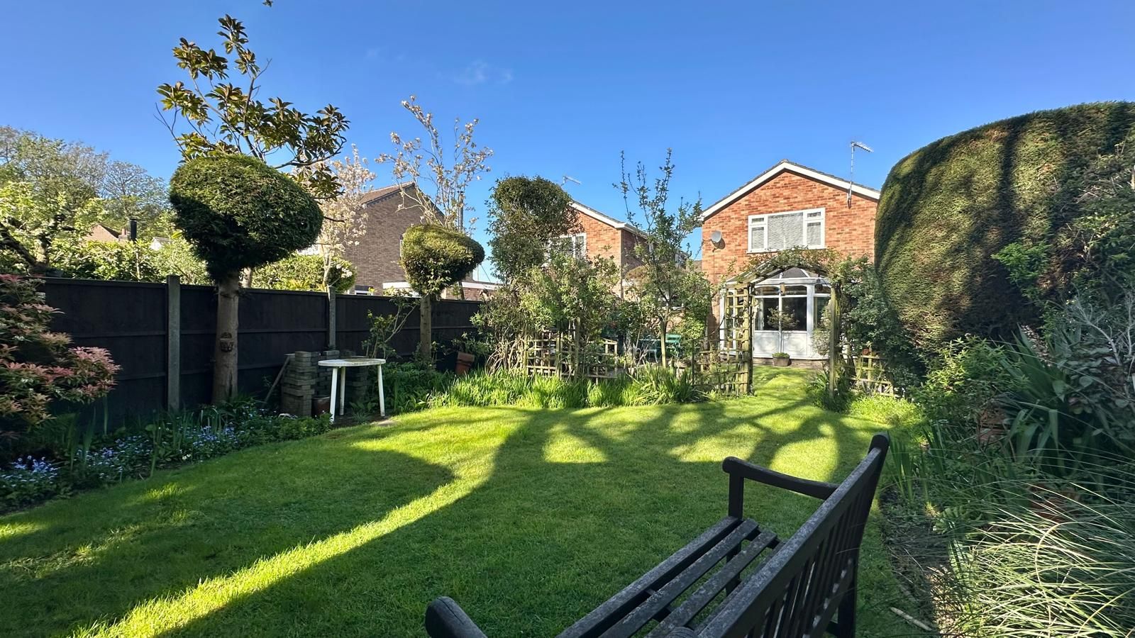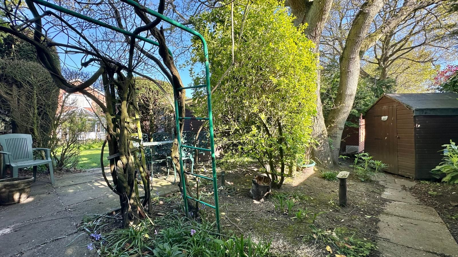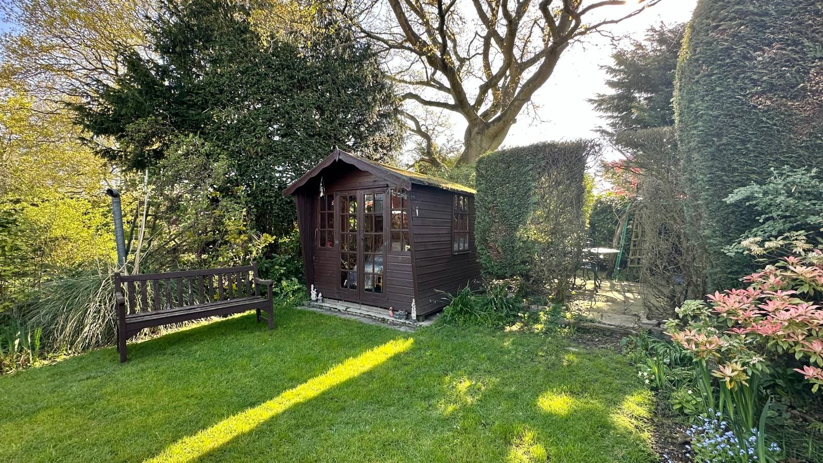 A mature well established rear garden with a patio off the conservatory & a slabbed pathway, mostly laid to lawn, a private patio to the bottom of the garden with a summerhouse, shed, mature shrub borders & trees.
