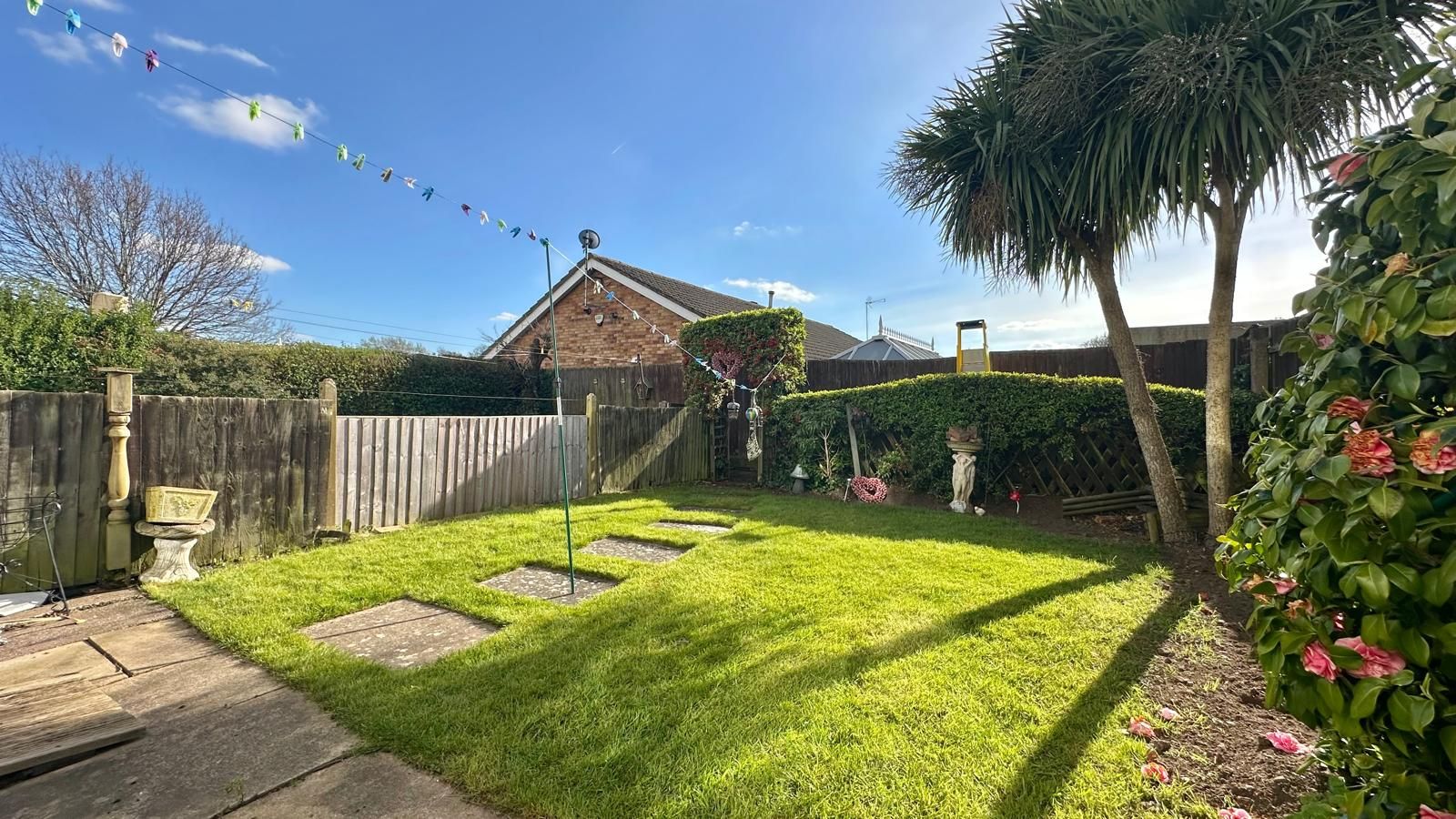 South facing rear garden benefitting from a slabbed patio area then laid to lawn, mature plants, trees & hedgerow, wooden fencing to both sides, pedestrian access to the rear.
