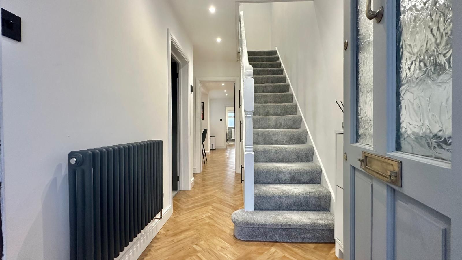 Stairs off to the first floor with understairs storage cupboards. Herringbone flooring. Column central heating radiator. Doors to Kitchen/Diner and: