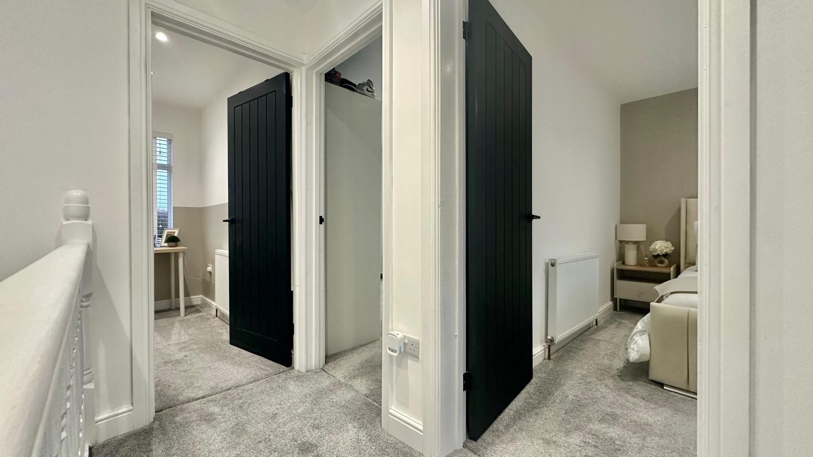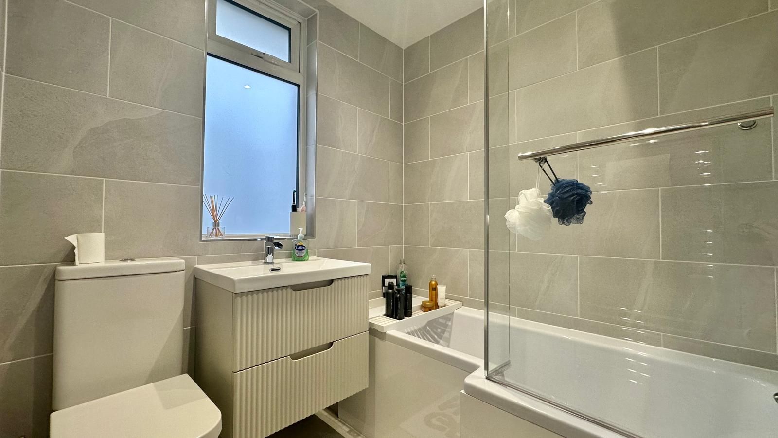 Re-Fitted bathroom suite comprising panelled bath with rainfall shower over with secondary hose, glass shower screen. Low level wc. Vanity sink with storage below. Chrome heated towel rail.