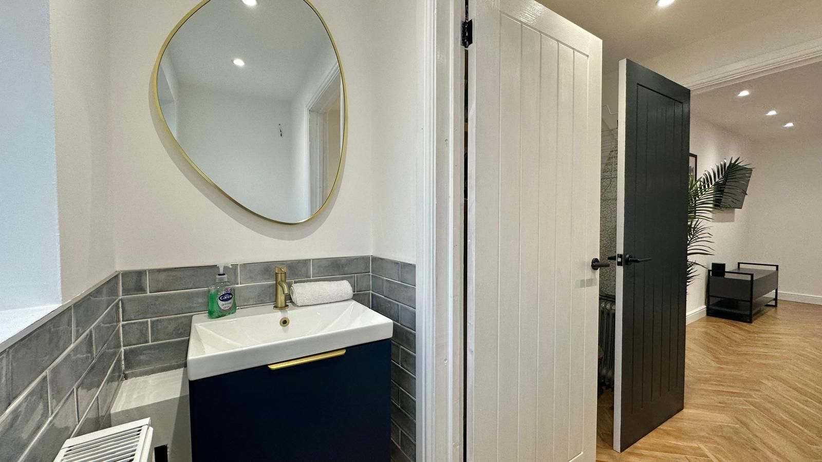 Low level wc, vanity sink with brushed gold tap and storage below. Part tiled walls. herringbone flooring. UPVC double glazed window to the rear. Central heating radiator.
