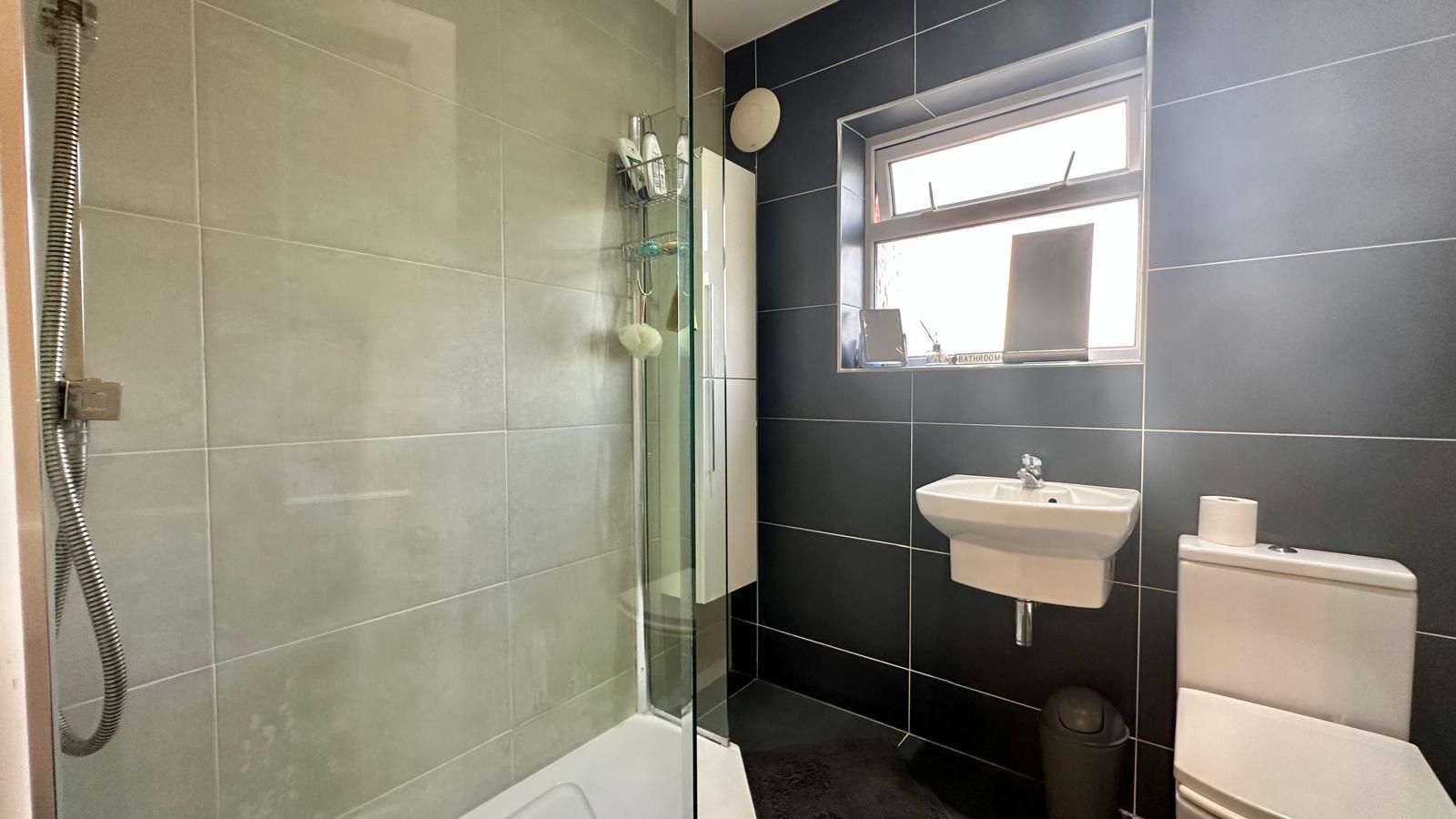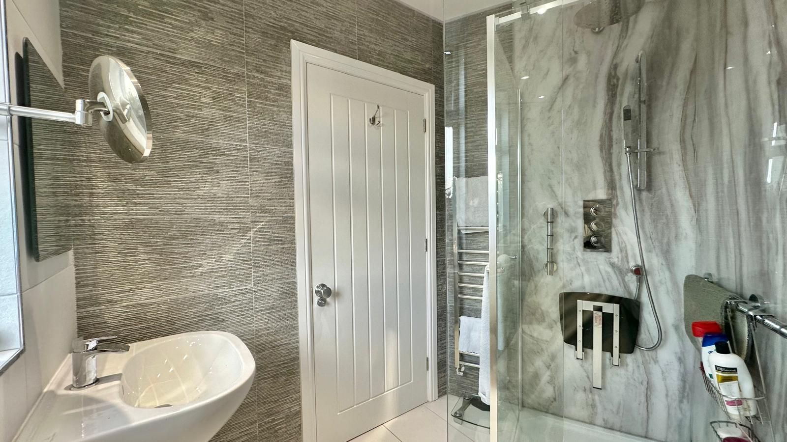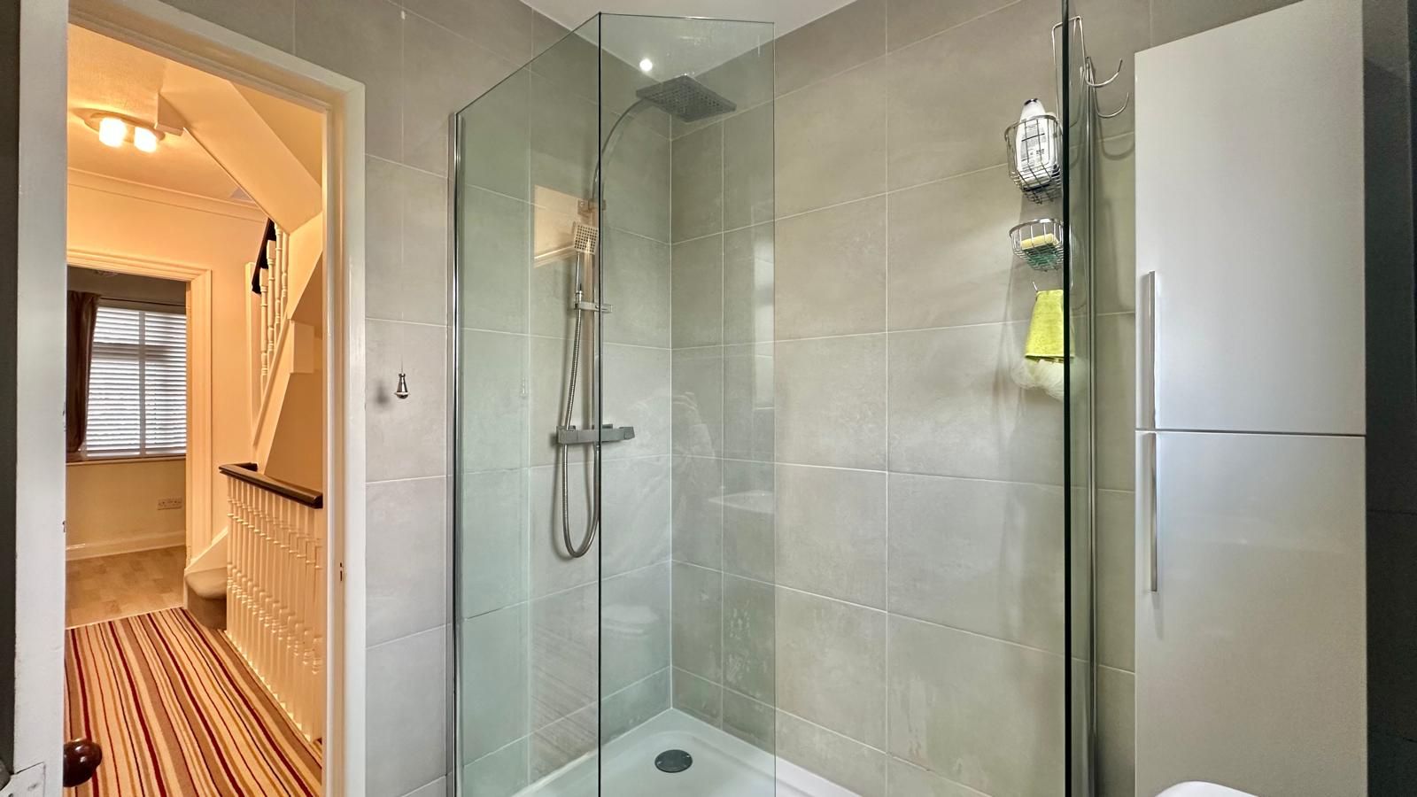 Low level WC, hand wash basin, walk in shower cubicle with rainfall shower & secondary hose attachment, tiled floor, tiled walls, heated towel rail, UPVC Double glazed window to the rear.
