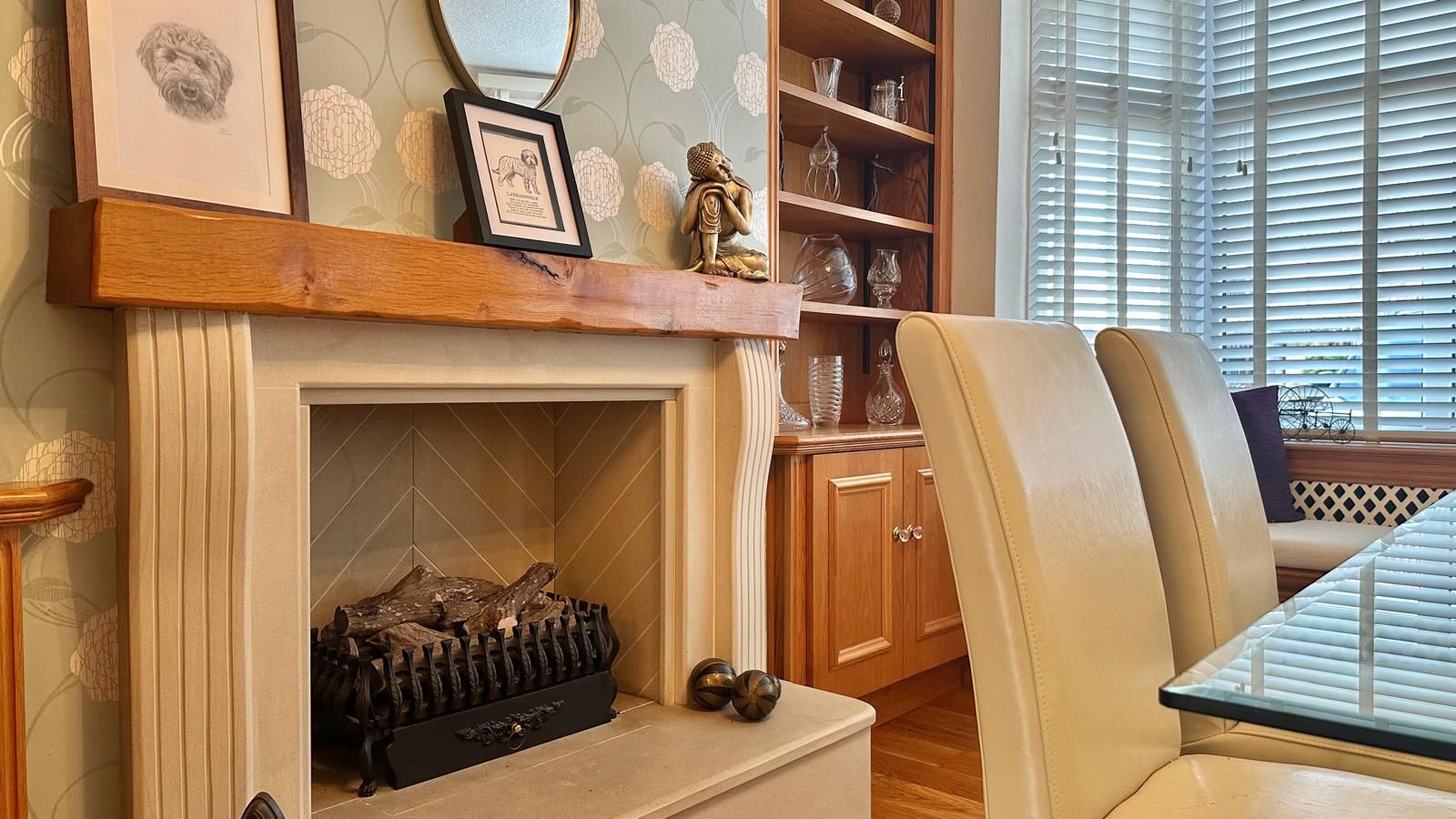 Central Heating radiator, oak flooring, UPVC Double glazed bay window with bay window bench, open gas fire set in luxury fireplace with oak surround, built in cupboards, double doors into the lounge: