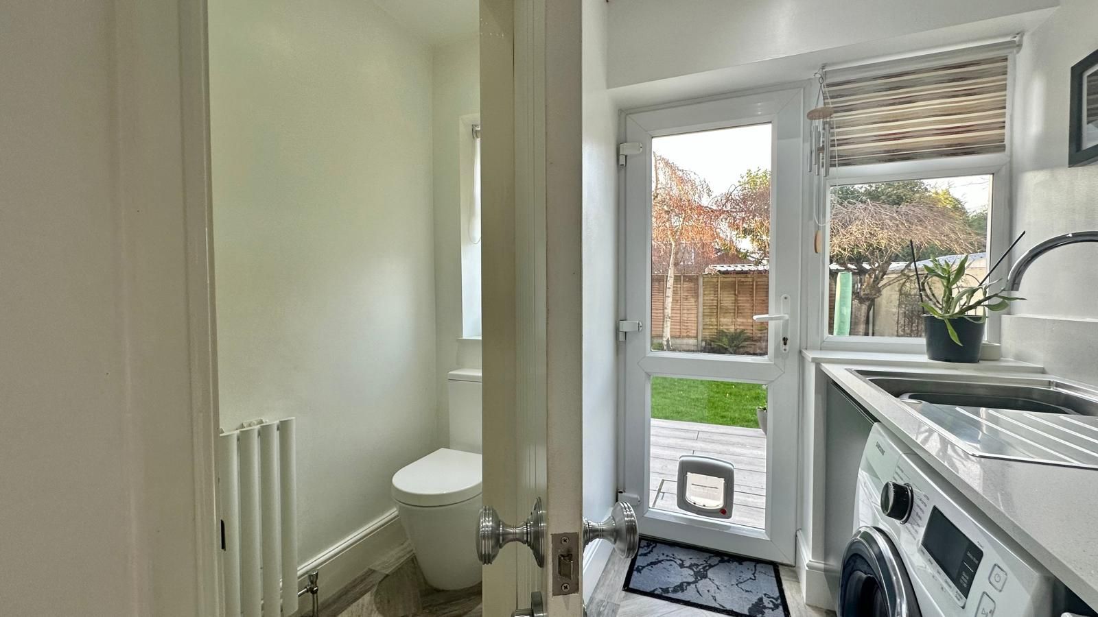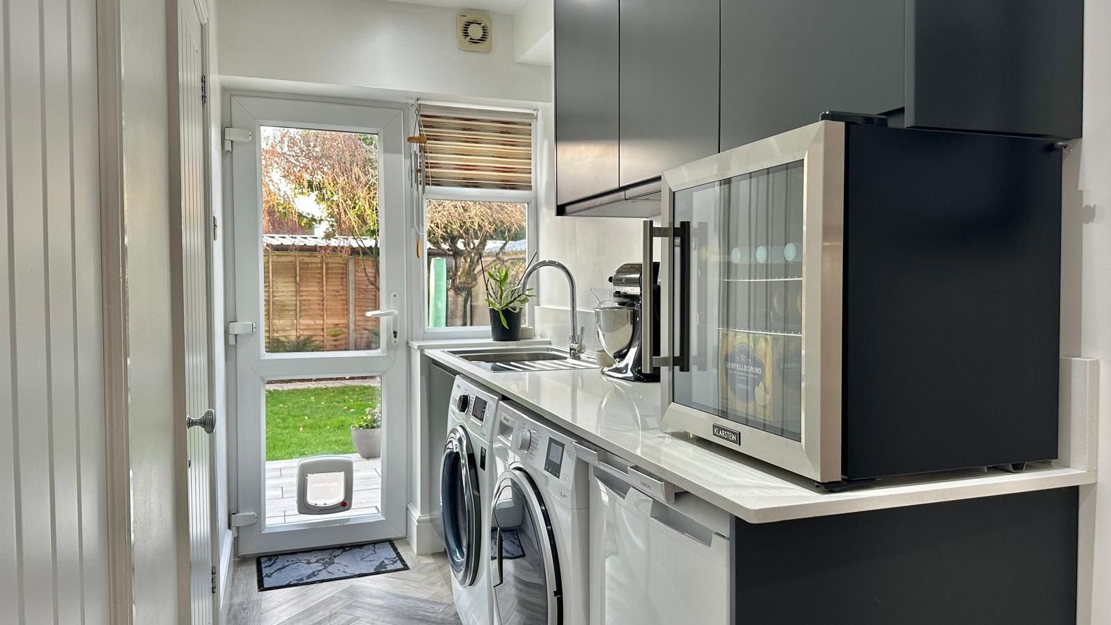 Stunning Kitchen recently modernised benefiting from Ample wall & base units with Quartz work tops over & splashbacks, Integrated dish washer, Integrated Fridge/Freezer, stainless steel sink unit with drainer & mixer tap with nozzle, Island with plug sockets & seating for four diners, space for large gas cooker with 'Rangemaster' extractor fan, UPVC Double glazed window to rear, UPVC Double glazed French doors to rear patio, Central heating radiator, door to Utility:
