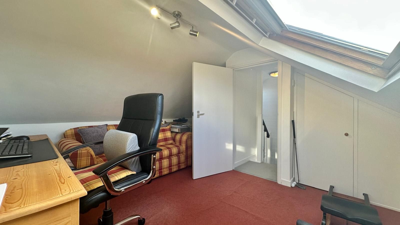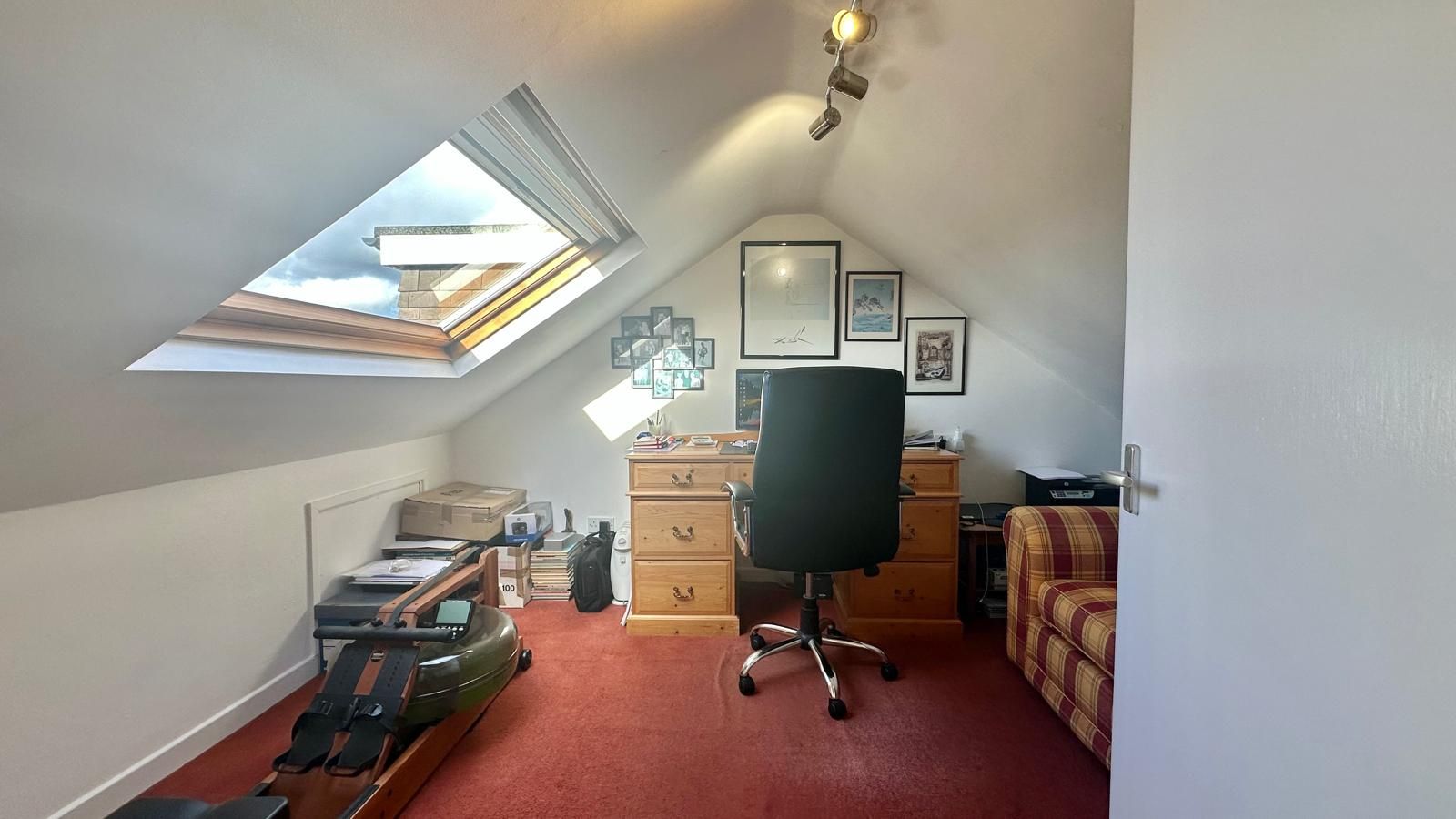Large Velux window to rear, built in storage cupboard, storage into the eves, power & lighting.